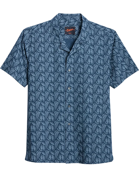 Crafted in batik fashion into a tropical fern pattern, this short-sleeved sport shirt by Egara offers a vacation-ready vibe. Woven from a cool cotton blend into trim, Slim Fit, it is both dress casual and on-trend.