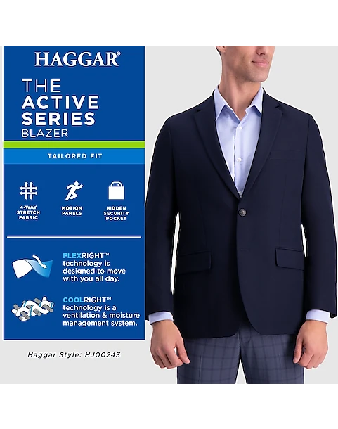 Tailored for topnotch flexibility and breathability, this stylish Haggar Active Series™ blazer caters to your busy lifestyle. It is constructed with temperature regulation technology and generous stretch to keep you cool, dry, and ultra comfortable.